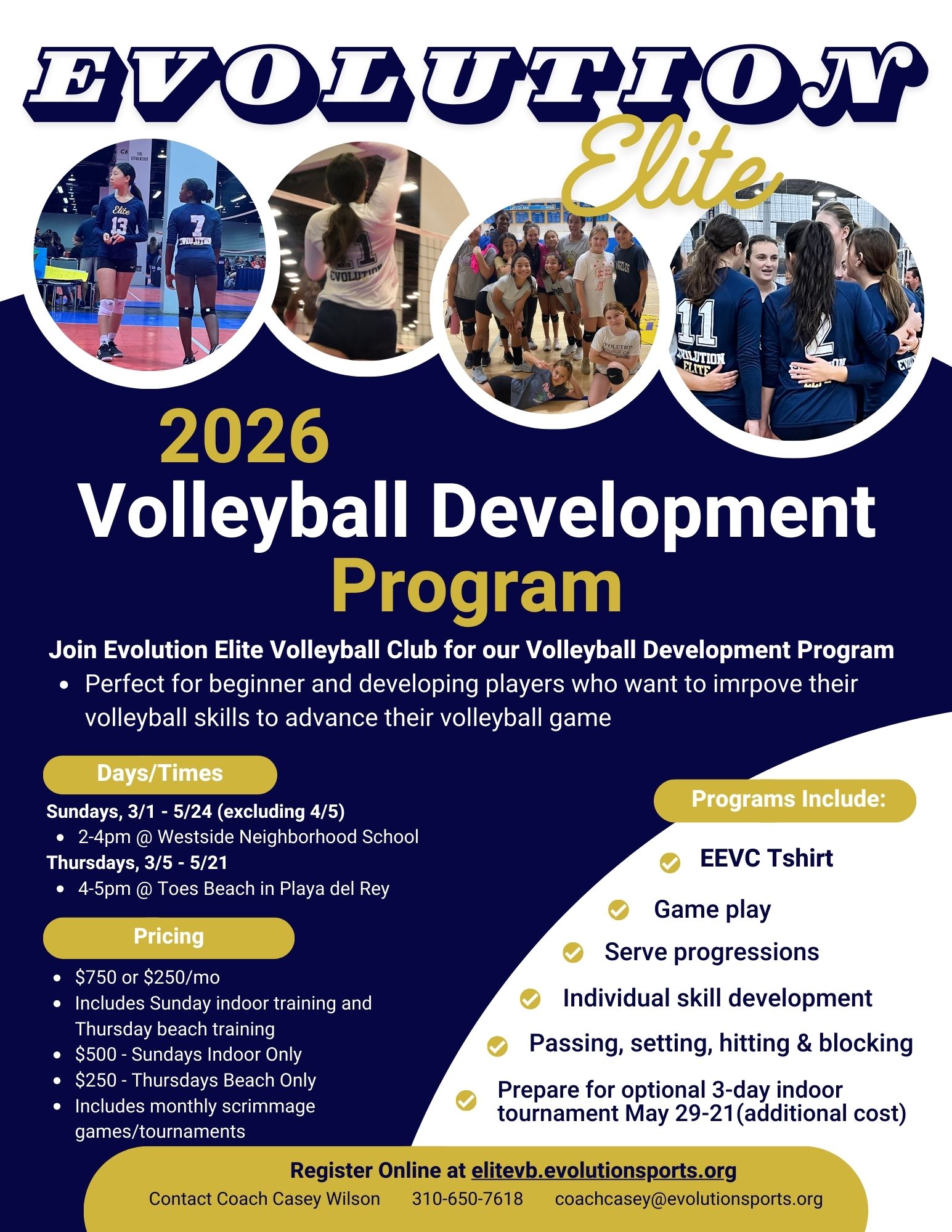 Evolution Elite Volleyball Development Program was created to help athletes who want to better develop their skill and learn the game of volleyball. Great for athletes of all levels who enjoy the game and want to prepare for the next level.